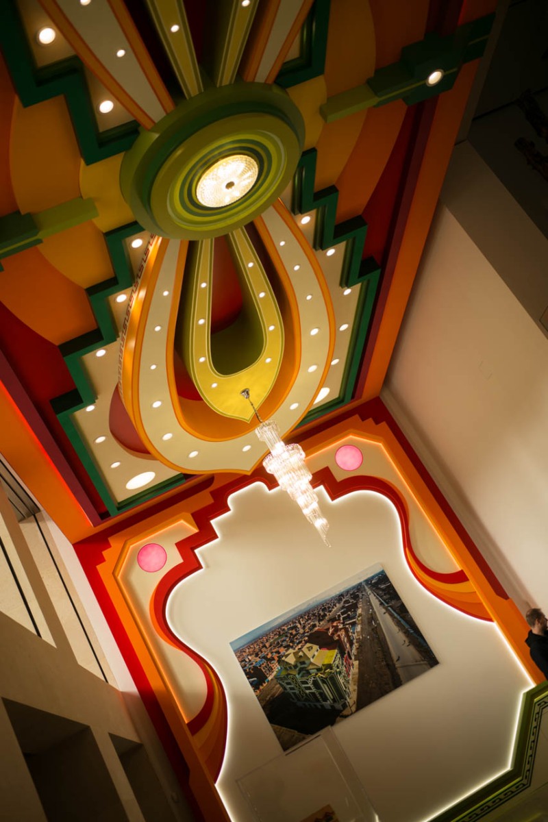 フレディ・ママニ《Salón de eventos》2018/インスタレーション(2025年イン・シチュ)。幾何学のレリーフと極彩色で天井を飾り、シャンデリアを下げる“ネオ・アンデス”様式の室内。ボリビア・エルアルトのアイマラ文化に根ざすショレ建築の祝祭性を、パリの展示空間に移植する。木、塗装、シャンデリア。収蔵2024年。