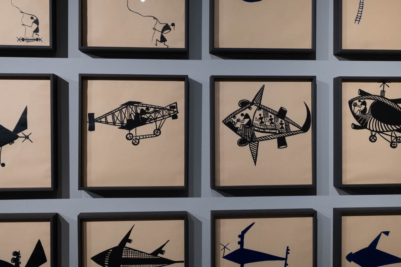 骨組みむき出しの飛行機や魚型の機体に人々が乗り込む。素朴な図式化と黒い平面が、飛行への夢想と創造の原理を直截に示す。インク/紙、1995年。