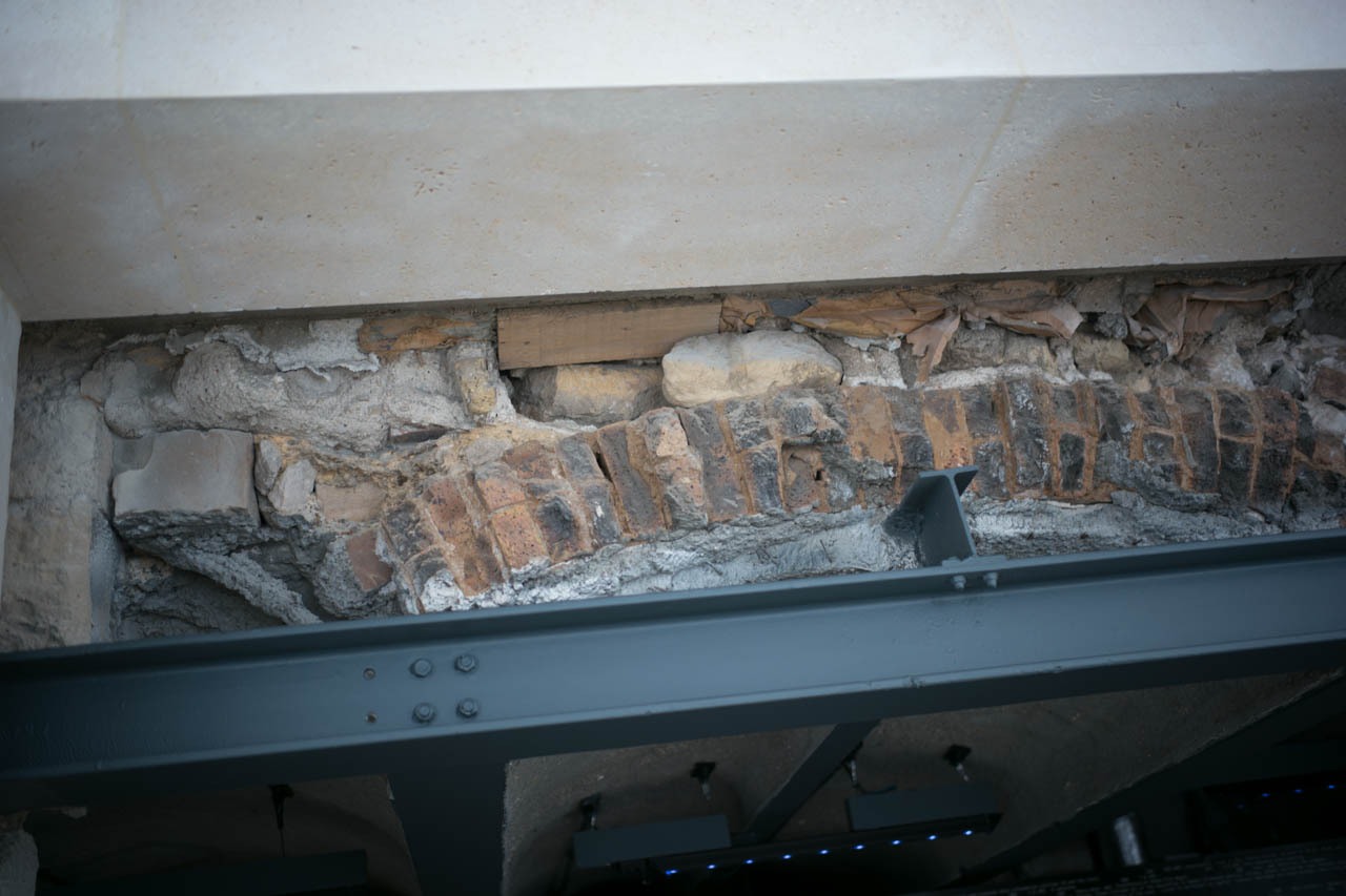 石灰岩の被覆の隙間から、煉瓦アーチと石積みの“地肌”をあえて露出させる。再生された鋼梁との取り合わせが、パレ・ロワイヤル時代の構造と新しい美術館建築の時間差を示す。