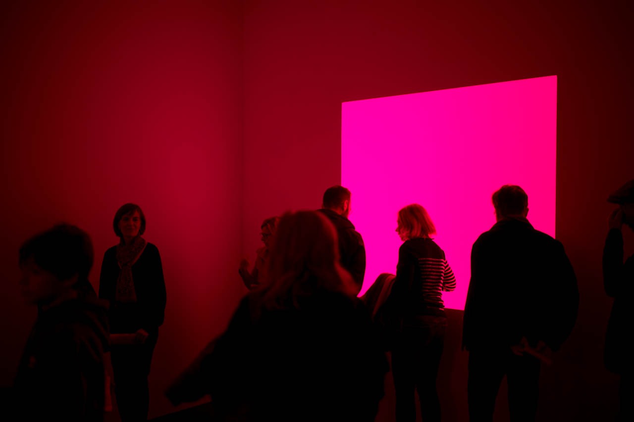 アメリカの光の作家ジェームズ・タレル(James Turrell)の《Skeet》は、赤と青の光が壁面の開口から放たれ、空間全体を紫に染める。観る者は「視覚の空間」と「知覚の空間」の境界に立ち、光そのものを物質のように体験する。