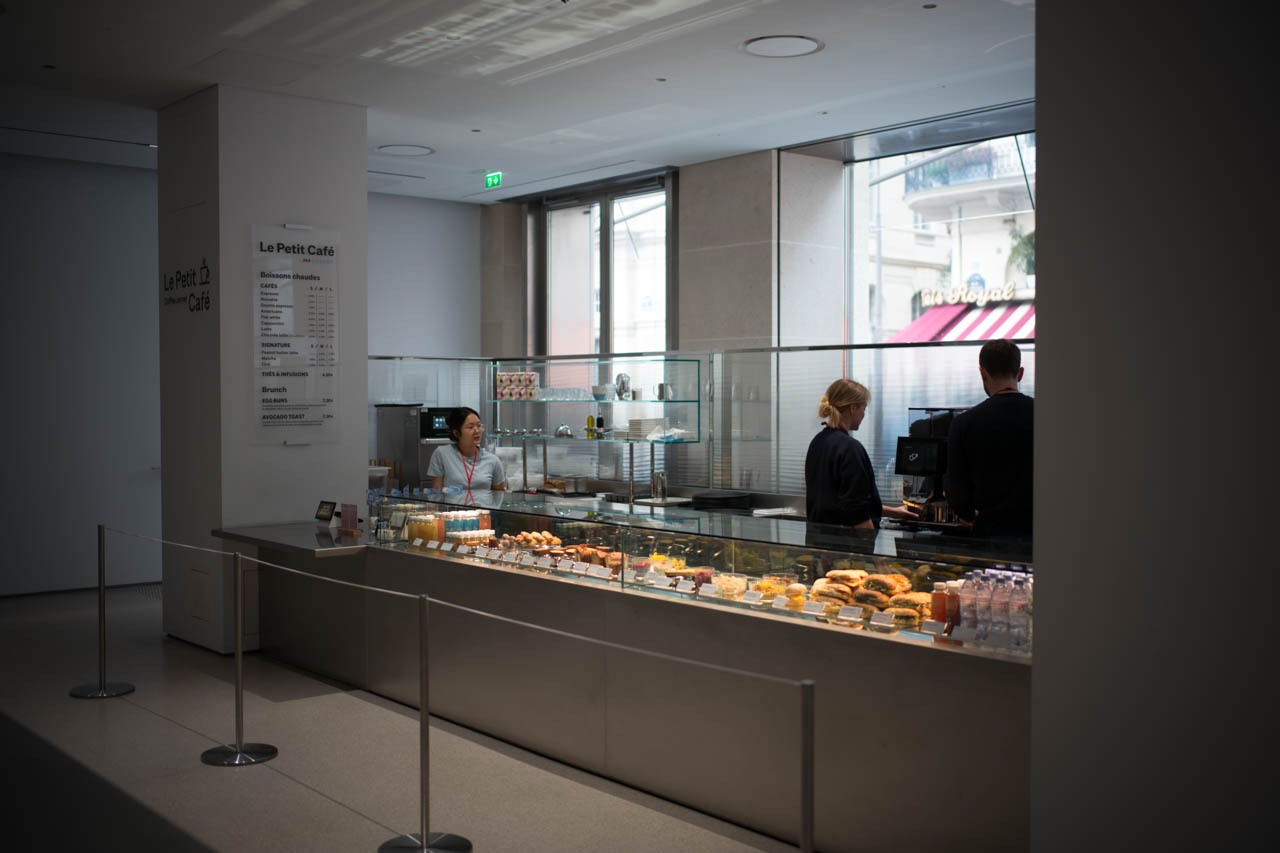 館内1階に併設されたカフェ「Le Petit Café」。展示空間の余韻を受け継ぐように、無機質なステンレスと柔らかな自然光が交差する静かな場所。焼き菓子や軽食が並ぶカウンター越しに、パレ・ロワイヤルの赤いオーニングが覗く。かつて商業の場であったこの建物の記憶が、日常のひとときとして再び息づいている。