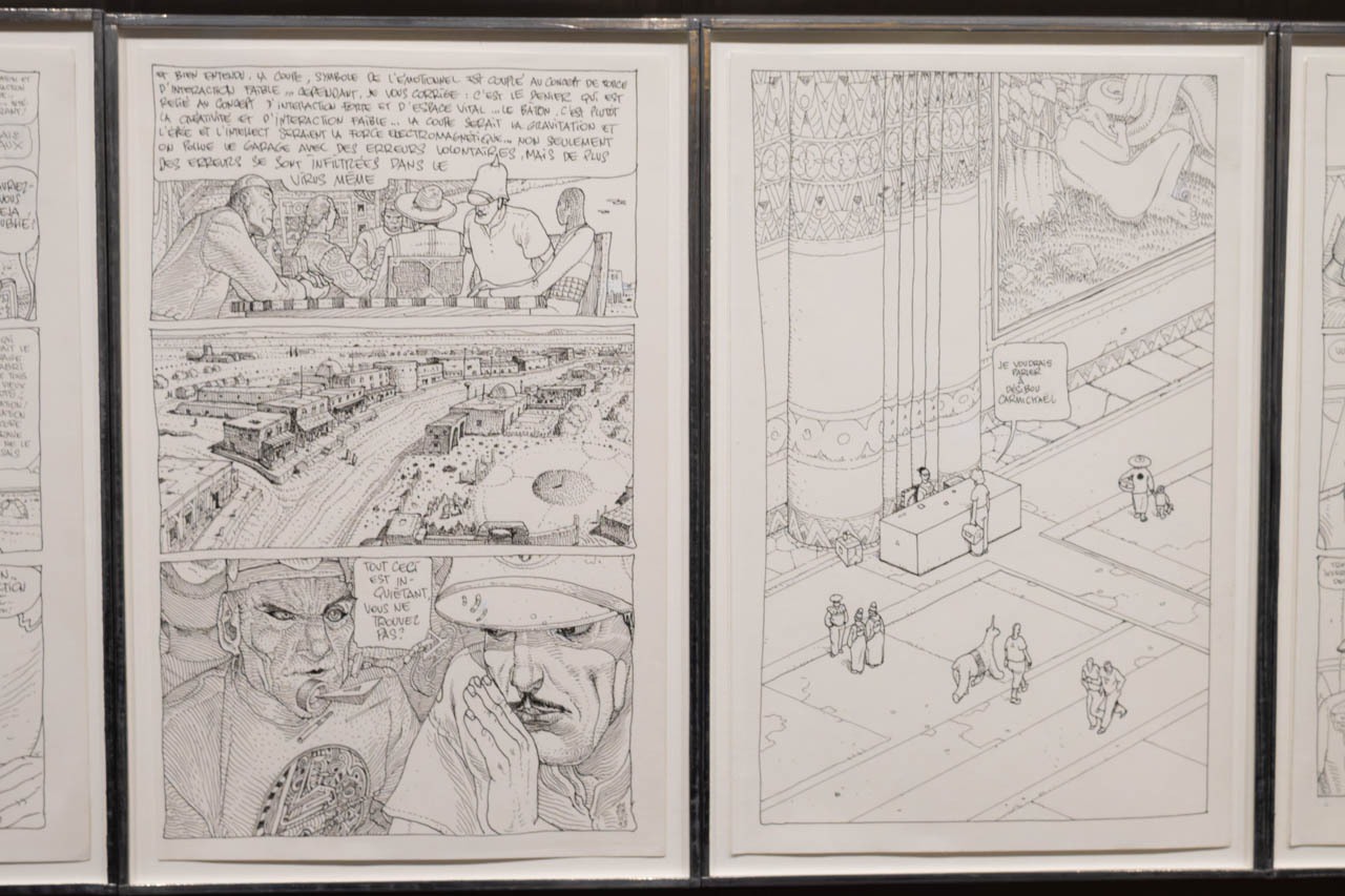 緻密なペン線で構築された場面は、物語の枠を超えて現実の断片と幻想の構造を往還する。ここでは建築的な遠近法と人物描写が融合し、視覚の物語性そのものを問い直すように展開されている。これらのドローイングは漫画原稿という媒体を超え、思念の構築や物語の生成過程を可視化する点で、現代美術の「版=痕跡」としての概念とも響き合う。