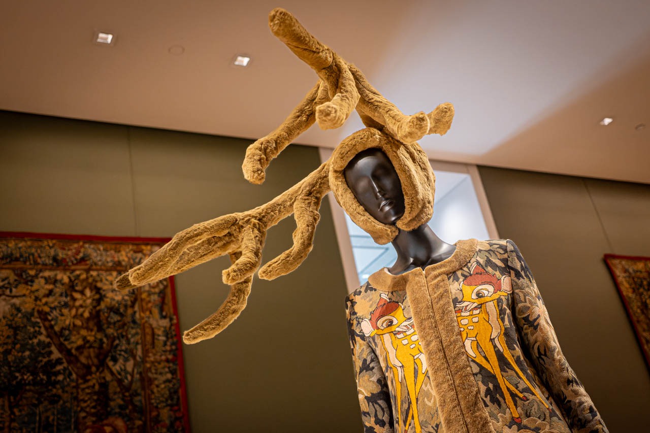 ジャン=シャルル・ド・カステルバジャックによるこのルックは、17世紀のタピスリーに描かれた「マクシミリアンの狩猟」から抜け出してきたかのような幻想性をたたえている。ディズニーのバンビを模した子鹿のモチーフをジャカード風に配し、毛足のある帽子で大鹿の角を再現。壁を飾る織物と共鳴しながらも、中世の武勇と現代のポップカルチャーが軽やかに交錯する姿は、カステルバジャック特有のユーモアと詩情に満ちている。展示された部屋の壁面には、自然や狩猟を主題にした大判のゴブラン織が掛けられ、本作との間に時間と素材を超えた対話が生まれている。