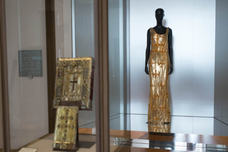 ジアンニ・ヴェルサーチによる1997–98年秋冬オートクチュールのドレスは、ビザンティン美術に着想を得た金属メッシュ素材に無数の十字架を刺繍した構築的な一着。背景に並ぶ聖遺物の装飾写本と同じ空間で対峙させることで、装飾という視覚言語の持つ宗教的・芸術的意味を問い直す構成がなされていた。メトロポリタン美術館での『ビザンティンの栄光』展からインスピレーションを得たこの作品は、クチュールがいかに深く美術史と共鳴し得るかを物語っている。