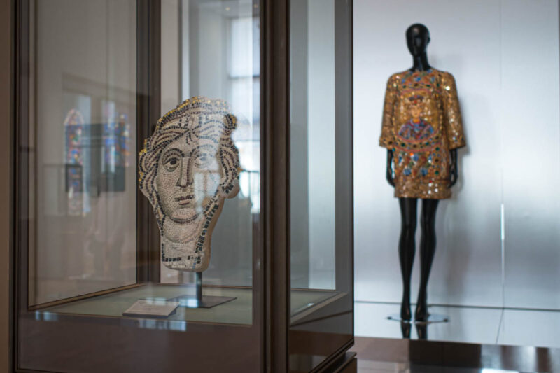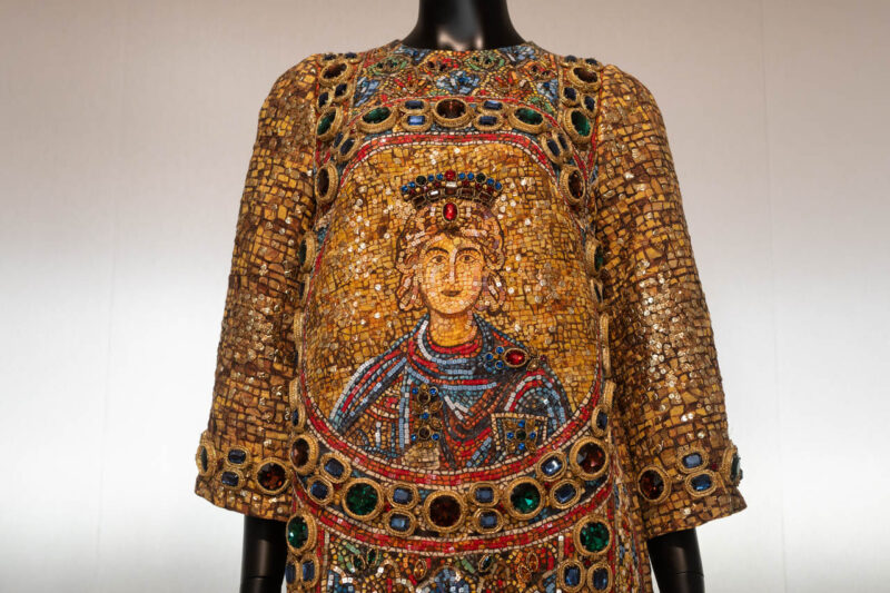 教会から発掘されたビザンティン時代のモザイク片と、それを引用したドルチェ&ガッバーナの2013–14年秋冬ドレスがガラス越しに対峙する。素材も構図も異なるが、光を受けて煌めく装飾の密度が、1200年の時間を超えて美の本質に触れる瞬間を作り出していた。