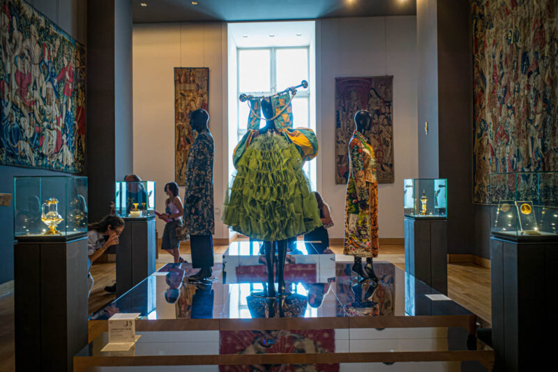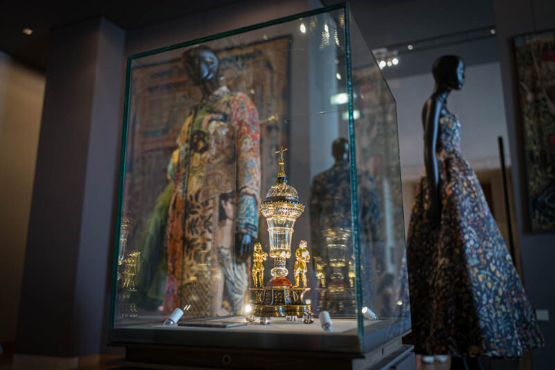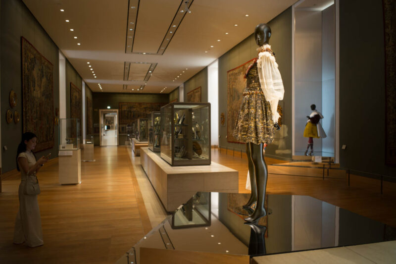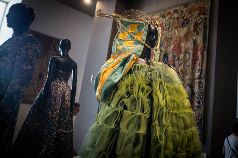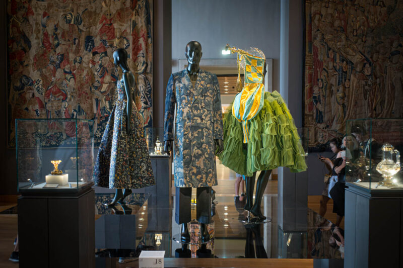 ルーヴル美術館リシュリュー翼1階の505室(サロン・モンジュ)に設けられたこの展示空間では、壁を飾る中世のタピスリーとともに、ジョン・ガリアーノによるクリスチャン・ディオールの幻想的なオートクチュールが並ぶ。映画『Les Visiteurs du Soir』(1942年)にインスピレーションを受けたこのシリーズは、15世紀末のフランスを舞台にした中世幻想の世界を色彩と構築で現代に再解釈したもので、衣服がまるで物語そのもののように空間に展開されていた。