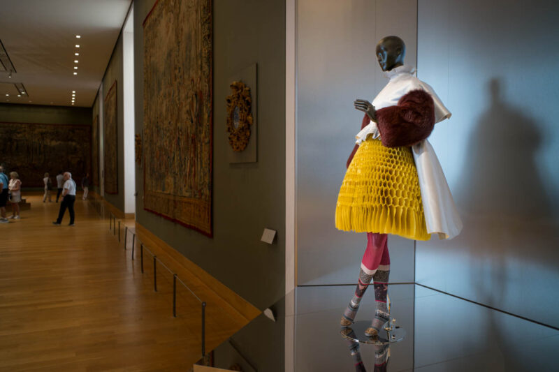 興味深いのは、この展覧会がいわゆる“モード展”でありながら、展示手法としてファッション作品に特別な照明や強調を施すことがないという点である。リシュリュー翼の展示室には自然光がほとんど入らず、タペストリーなどの保存のために部屋は薄暗く保たれている。その中に、あたかもそこに昔から存在していたかのように、ドレスたちはひっそりと展示されている。よく目を凝らさなければ、装飾家具や調度品に紛れて見落としてしまうほどの存在感の低さが、かえって作品と空間との融合を際立たせている。