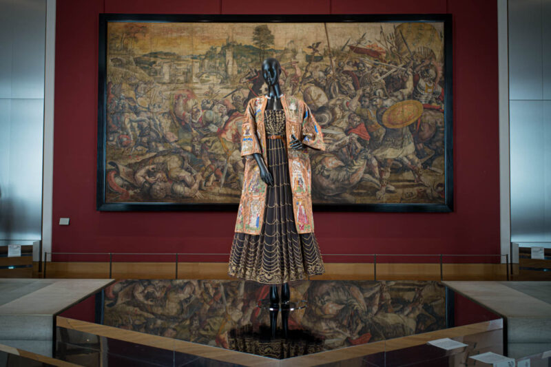 マリア・グラツィア・キウリによるこのドレスは、クリスチャン・ディオールが生前親しんだ占いとタロットへの信仰を、15世紀のヴィスコンティ=モドローネ版タロットに重ねて刺繍として可視化したもの。図像化された運命の象徴たち(太陽、王、愚者、運命の輪など)が緻密に縫い込まれたマントは、装飾と占いが不可分であった時代への精神的回帰でもある。背景に掲げられた戦闘を描いた大判のタピスリーと並置されることで、個人の宿命と歴史の運命、その二重の“戦い”が視覚空間の中に重なり合う。装飾が持つ意味の層が、ここでは衣服そのものを超えて、時代や信仰、そして美術館という場にまで浸透していた。