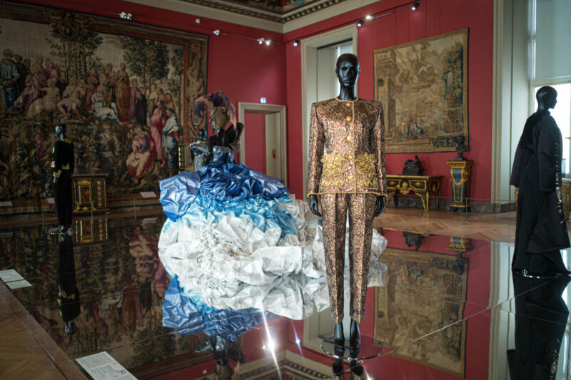 本展では、歴史的なスタイルと現代の実験精神が緊密に交錯している。たとえばイリス・ヴァン・ヘルペンやメゾン・マルジェラなどの作品は、伝統的なクチュールの技法に最先端のテクノロジー──3Dプリントや透明素材、構造的アプローチ──を融合させることで、「着る芸術」としてのファッションの可能性を拡張している。