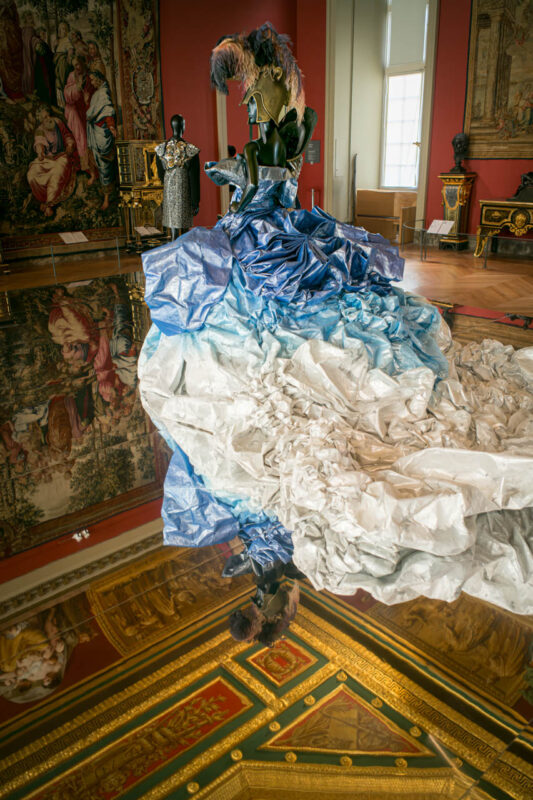 天井画と壁を飾る絢爛たるタピスリー、そしてルイ14世様式の重厚な家具に囲まれたこの部屋は、かつての王室礼拝堂を改装してつくられた壮麗な空間である。鏡面仕上げの床面が天井を映し出し、全体を劇的な舞台装置に変貌させる中、中央にはジョン・ガリアーノがクリスチャン・ディオールのために手がけた2006–2007年秋冬オートクチュールのドレスが置かれている。氷河のように青から白へとグラデーションを描くドレープと、そこに重なる羽飾りが幻想的な印象を与え、隣り合うイヴ・サン=ローランやルイ・ヴィトン、シアパレッリの作品とともに、空間の壮麗さと相まって観る者に忘れがたい余韻を残す。