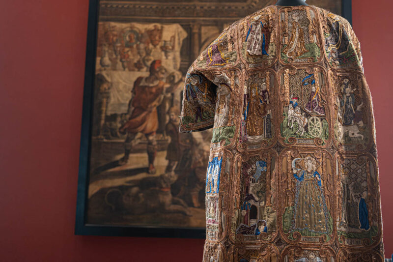 マリーン・セルによる〈Rising Shelter〉は、廃棄された装飾布=かつてのタピスリーを再利用し、断片的な記憶と物語を縫い合わせて構成されたプレタポルテ・コート。花々、動物、唐草などのパターンが折り重なったその衣服は、終末的な未来におけるサバイバルと装飾性の再解釈を提示する。一方、手前に置かれた17世紀初頭の「鞭打ちの聖遺物容器(Reliquaire de la Flagellation)」は、信仰と儀式を可視化するために生まれた工芸の極致。その並置は、装飾が持つ「保存」「象徴」「語る力」を、時代と用途を超えて呼び覚ましていた。