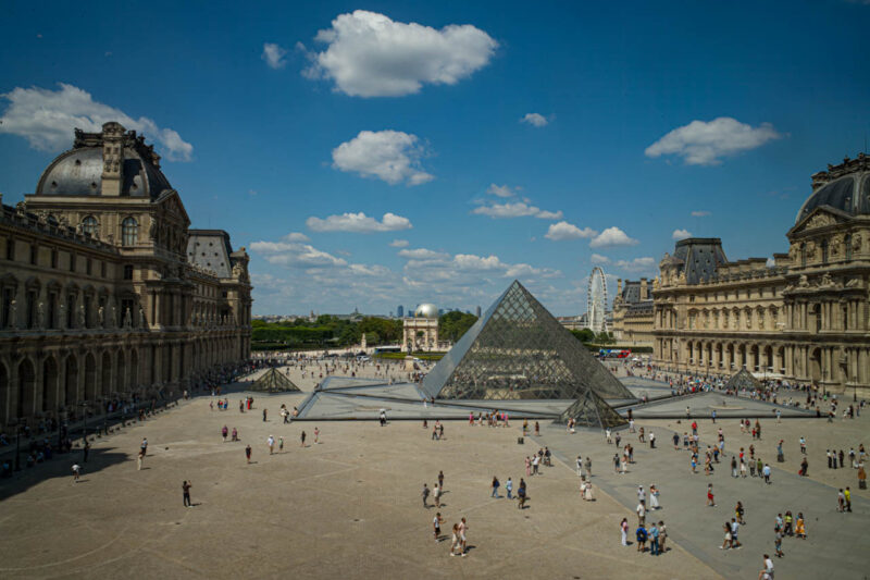 ルーヴル美術館のある展示室の窓から眺めた中庭には、ガラスのピラミッドが燦然と輝く。奥には、2024年のパリ・オリンピックで聖火を灯すために使用されたシルバーの気球が再び姿を見せており、記念展示として設置されている様子が伺える。右手のチュルリー公園では、毎年恒例の夏の遊園地が始まり、パリに夏の訪れを告げている。広場に人影がまばらなのは、この日の強い日差しが肌を焼くほどで、多くの人が日陰に避難しているからだ。とはいえ、相変わらず観光客で賑わうパリの中心部では、街中を歩いていてもフランス語より外国語のほうが多く耳に入るほど。バカンスに出かけたパリジャンたちに代わって、世界中からの来訪者がこの地を埋め尽くしている。