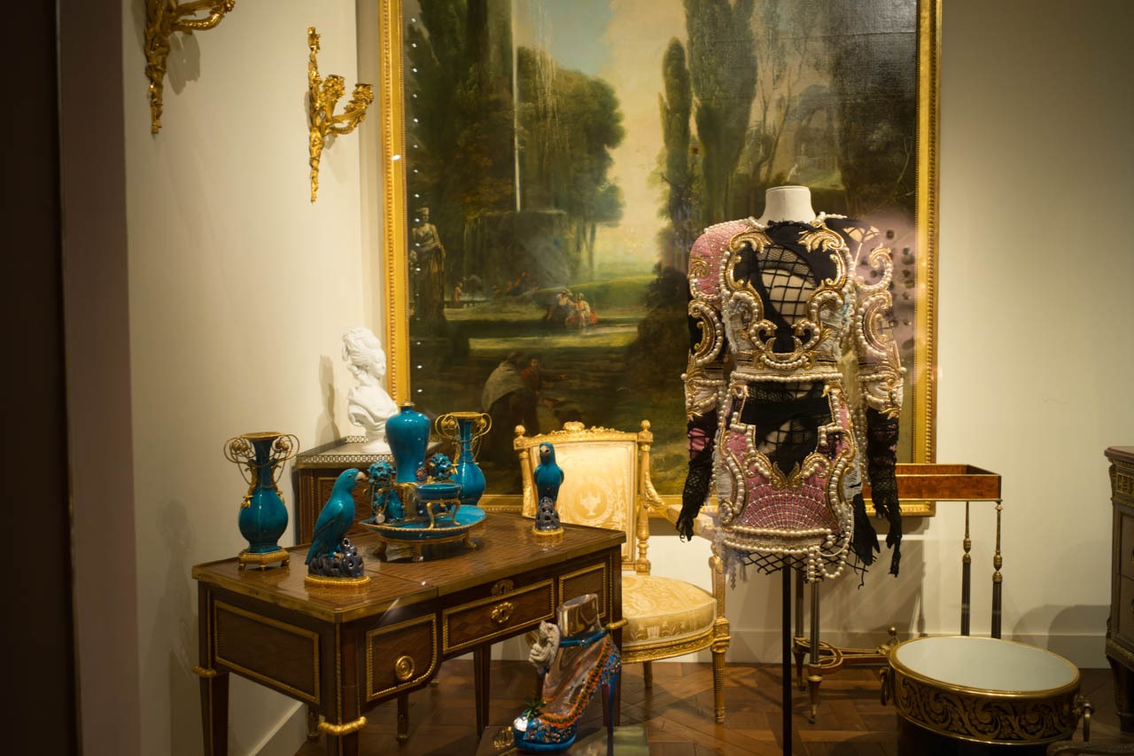 豪奢な金装飾や陶磁器、淡いパステルカラーに包まれた小物の数々が並ぶ一角に、オリヴィエ・ルステンによる刺繍ドレスが置かれている。ヴェルサイユの輝きとグランジ・カルチャーを融合させたこの作品は、18世紀末の宮廷美学と、現代的な身体表現とのあいだに新たな対話を生む。特に、マリー・アントワネットが好んだ優雅な装飾性へのオマージュは、室内に展示されたルイ16世様式の家具や陶器とも共鳴し、過去と現在の美意識の架け橋となっている。