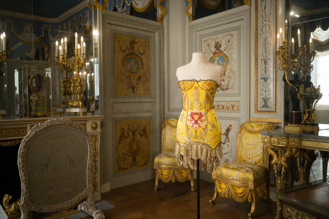 明るい黄色の地に花柄のブロケードが浮かび上がるこのミニドレスは、ドナテラ・ヴェルサーチが2002–2003年秋冬のプレタポルテ・コレクションで発表した作品。ルイ16世の弟アルトワ伯のために制作された〈トルコ趣味〉の装飾と調和しており、18世紀の裕福な室内装飾に流行した東洋趣味の影響を色濃く映している。スフィンクスやラクダ、カフタンやターバンを身につけた人物などが登場する幻想的なオリエントのイメージは、ドレス裾の金糸レースにも反響し、椅子の座面や鏡の縁を飾る織物を想起させる。