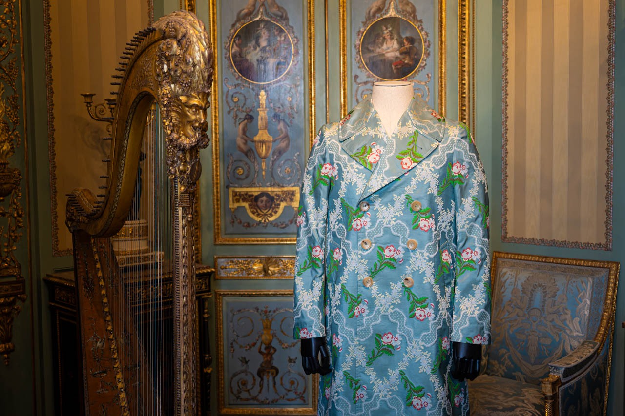 ドリス・ヴァン・ノッテンによるこのロングコートは、タピスリー織の構造そのものを模したテキスタイルによって、中世装飾の「織りの記憶」を現代の衣服に移し替えている。ジャカード織によって再構築された文様は、リシュリュー翼505室の壁面を飾る本物のタピスリーと呼応し、視覚的装飾と技法的装飾の間にある美的断面を浮かび上がらせていた。