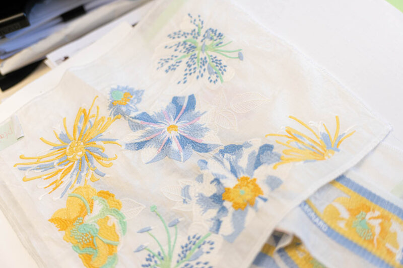 ここでは、原画を糸の太さや織り組織、ステッチ方向に合わせて再翻訳する作業が行われていた。プリントでは色の濃淡で表現される陰影も、ジャカードでは糸の密度や種類によって立体的に描かれる。刺繍では、ステッチの方向が光の反射を変え、モチーフにさらなる深みをもたらす。