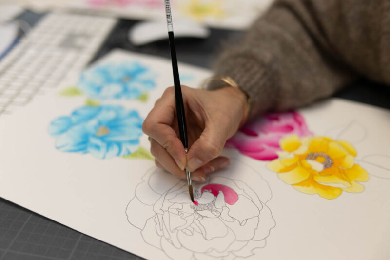 LEONARDのデザインは、まず手描きの原画から始まる。アトリエで対面したプリントデザイナーは、筆先で紙の上に花弁のグラデーションを置いていく。
