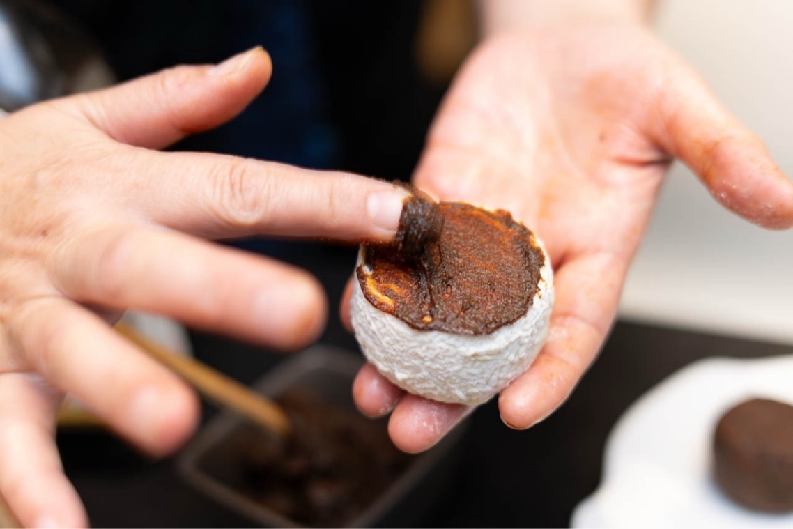 熟成を経て仕上げられた「Sakura Japon」。塩漬けの桜の葉と花がほんのりと香り、やさしい酸味とともにチーズに春の余韻を添える。見た目の可憐さとは裏腹に、味の構成は実に複雑で奥深い。久田さんの感性と熟成技術が融合した、唯一無二の一品。