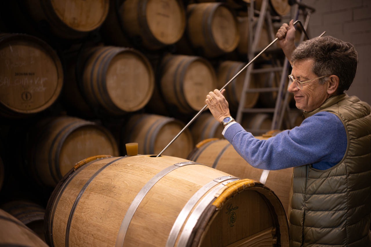 熟成が進む樽の中のワインは、週に一度ほど攪拌作業が行われる。