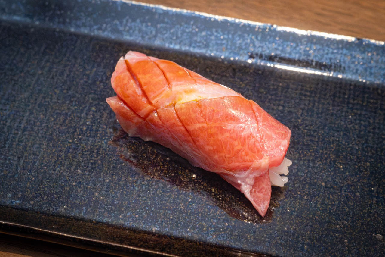 一週間寝かせた熟成トロ。煮切り醤油と山葵で香りを引き締め、脂の甘みを深く導く。時間の静けさが、旨味に変わる瞬間。