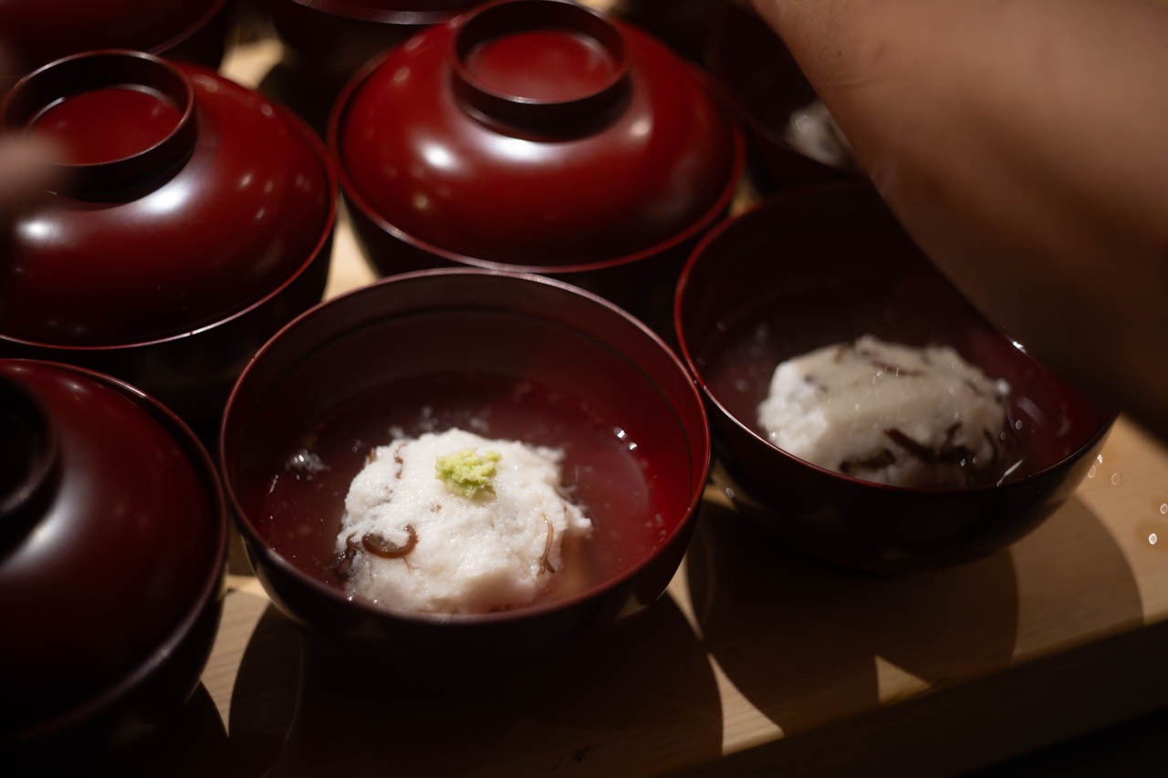 澄み切った出汁が注がれ、十人分のお椀が静かに並ぶ。湯気の向こうに、今宵の宴の頂が見える。