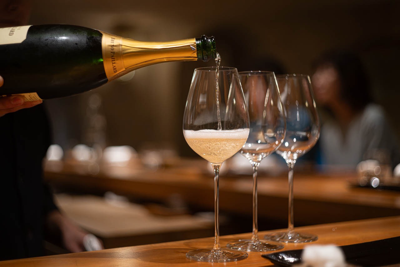 シャンパーニュのミネラル、日本酒の旨味、それぞれが京の出汁と共鳴し、皿の流れをやわらかく結ぶ。