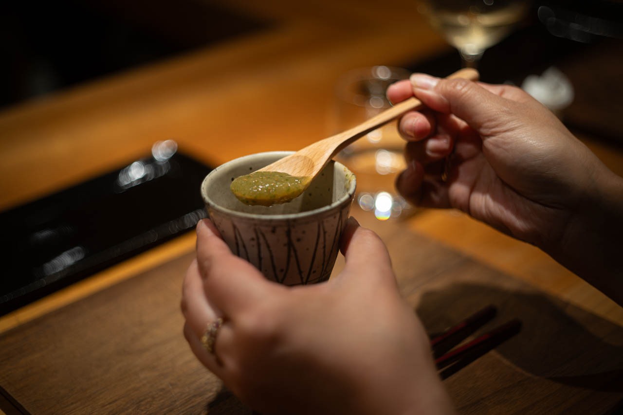 無花果と胡瓜のすり流し、発酵レモンの香り。果実のやわらかな甘みと胡瓜の青みを、発酵レモンの酸が静かに結ぶ。和と発酵のあわいをすくい取る一口。