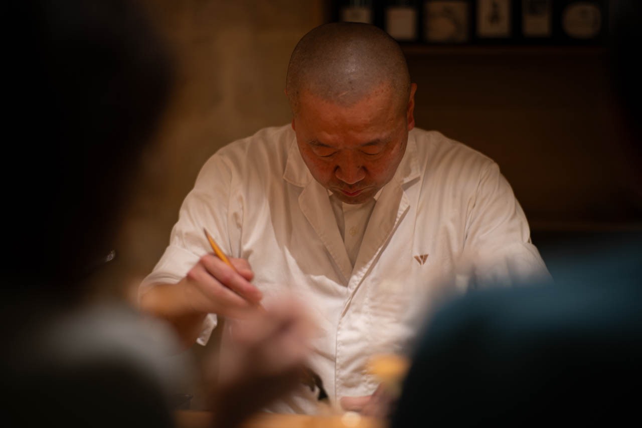 カウンター越しに、一皿ごとに向き合う遠藤シェフ。温度とタイミングを見極め、手元の所作だけで味を整える。静かな集中が、皿の上に結実する。