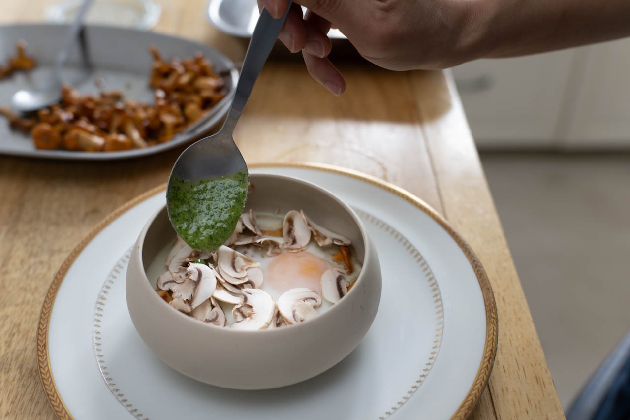 Cocotte d’œuf aux champignons, pesto de roquette, pecorino(茸のココット蒸し 卵、ルッコラソースとペコリーノ添え)。