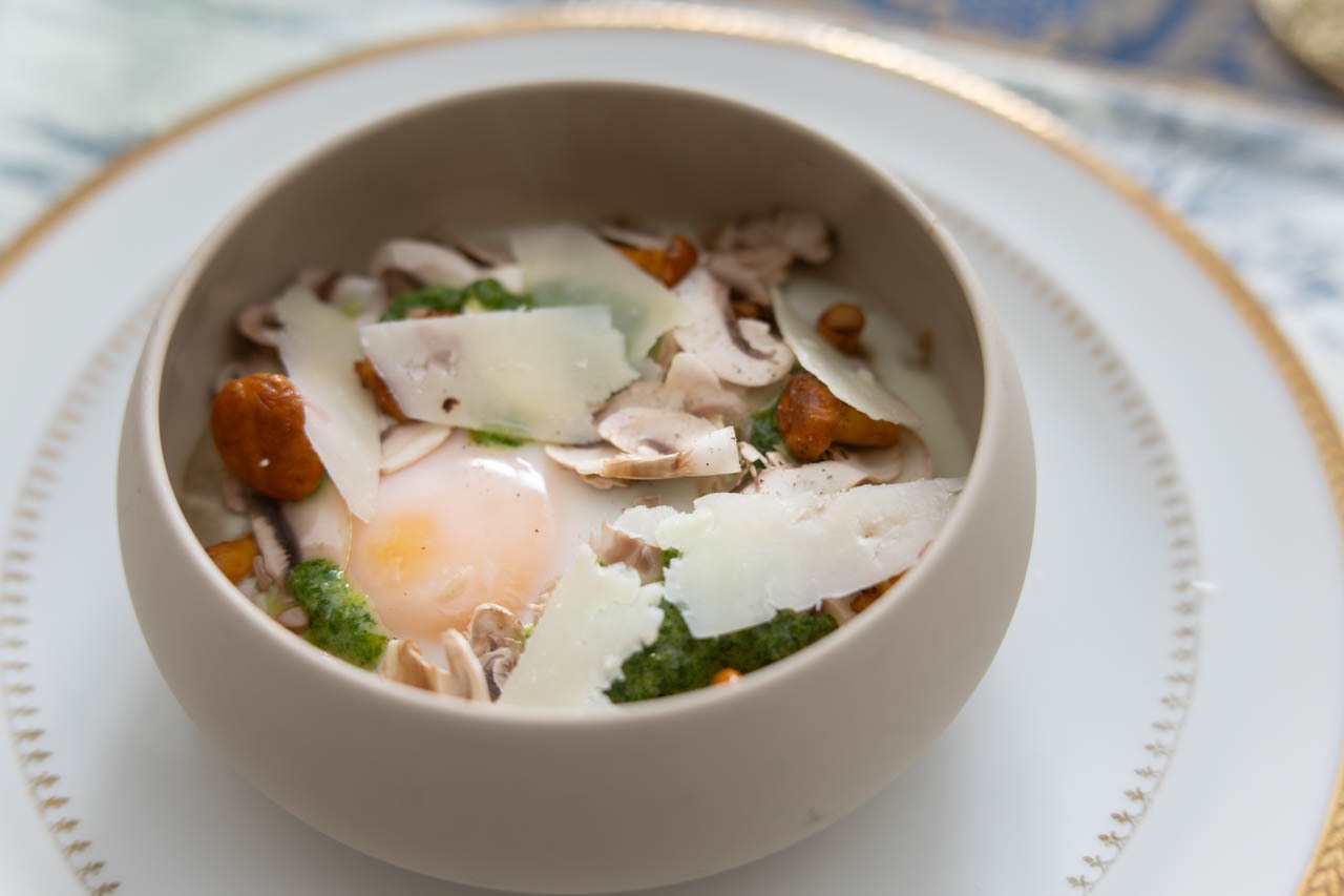 前菜には、卵を蒸し焼きにしたクラシックなココットに、ジロール茸とシャンピニョン・ド・パリの香り、pesto de roquette(ルッコラのソース)、羊乳のハードチーズ・ペコリーノが添えられる——