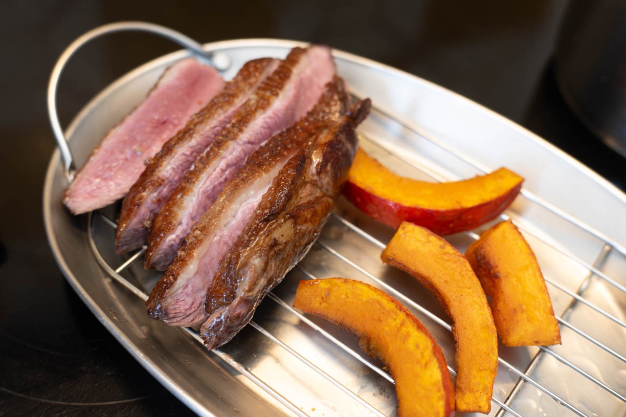 Magret de canard poêlé, betterave et potimarron rôtis, figue et réduction de Porto(鴨胸肉のポワレ ビーツと栗かぼちゃのロースト、イチジクとポルト酒のソース)。