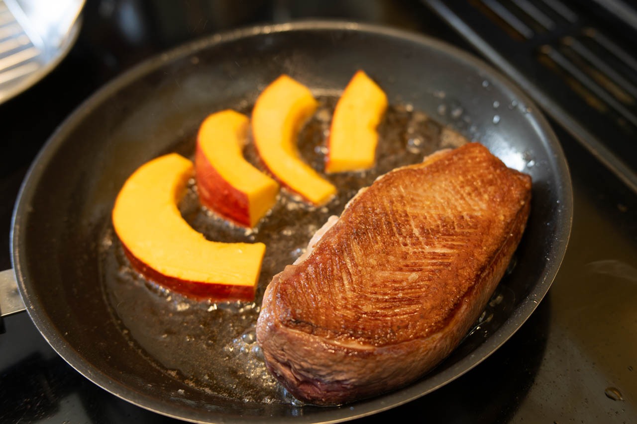 Magret de canard poêlé, betterave et potimarron rôtis, figue et réduction de Porto(鴨胸肉のポワレ ビーツと栗かぼちゃのロースト、イチジクとポルト酒のソース)。