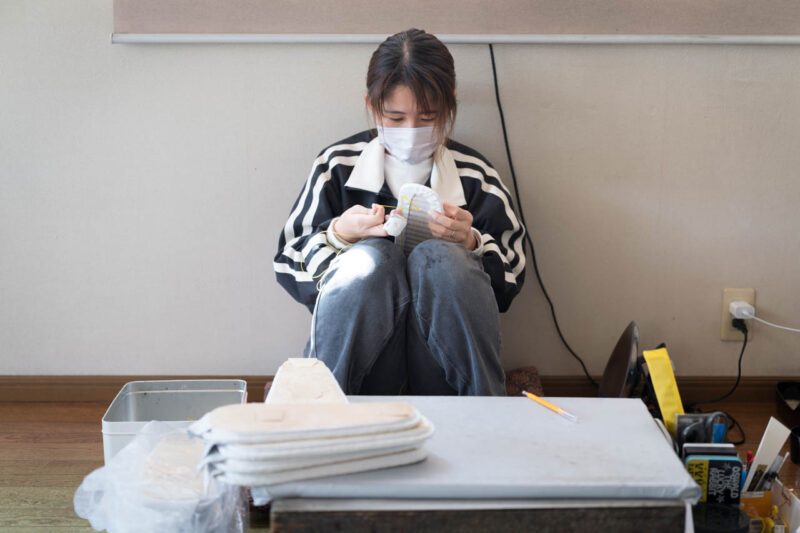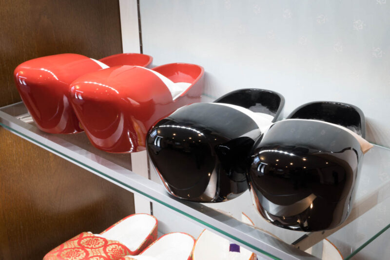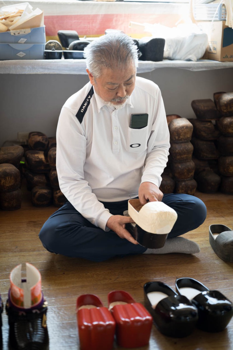 さらに別の若い職人は、仕上げの漆塗りを行っていた。作業中に履物を手で持つことはできないため、つくうと呼ばれる道具を内部に取り付けて安定させながら慎重に塗りを重ねていく。その手元は驚くほど落ち着いており、緊張と集中が空気を張り詰めさせていた。