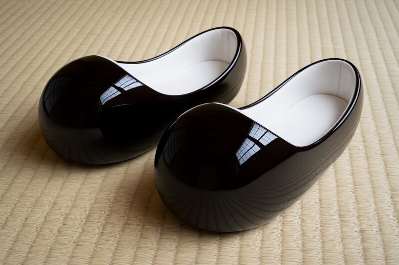 最後に見せてくださったのが、この美しく磨き上げられた一対の《塗り沓》。神社のご神宝の沓である。丸く削り出した独特のつま先の形状には威厳と静謐さを象徴する意味が込められており、深い黒漆に包まれたその姿はまるで沈黙の中に佇む祈りの器のようでもある。