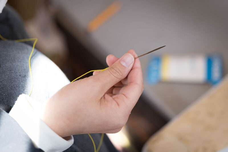 使用されるのは「三角針」と呼ばれる特殊な針。畳を縫う際にも用いられるもので、厚い革底に貫通させるためには力と正確さが求められる。指先に集中する力が、そのまま仕上がりの美しさへとつながる。