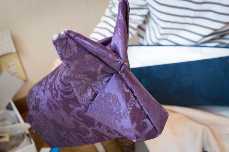 依頼主が長年使用してきた古い“烏帽子”。橋本甚蔵商店では、こうした実物を丁寧に解体・採寸し、同様の構造と意匠を持つ新しい帽子を仕立てる。伝統の継承と実用の再構築が交差する作業である。