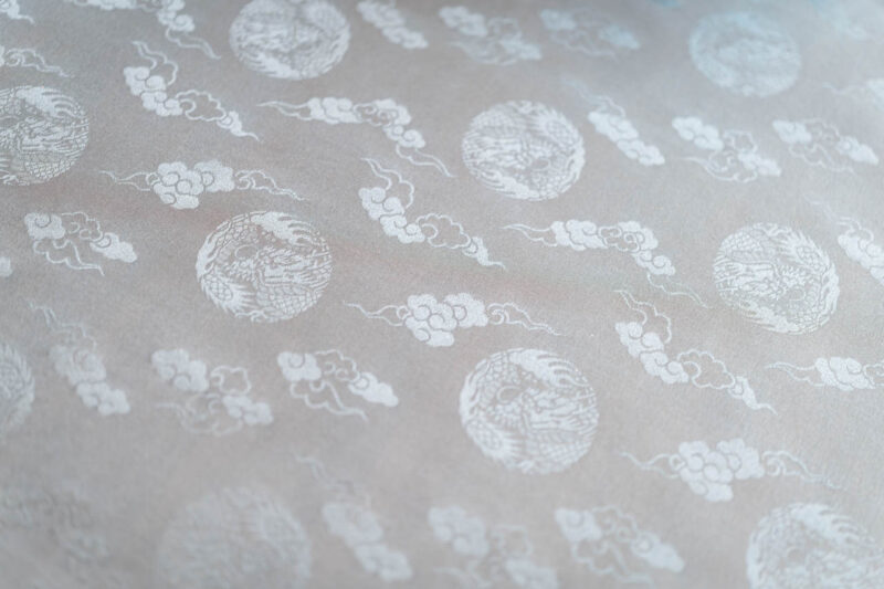 烏帽子の内張りに使われる文様織の布地。鳳凰と雲を組み合わせた意匠は、吉祥と荘厳さを象徴し、儀式にふさわしい格式を備える。見えない部分にも美しさと意味が込められている。