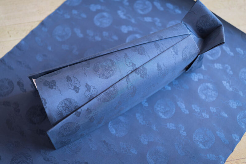 新たに仕立てられた烏帽子と、その外装に用いた文様織の布。鳳凰と雲が織り込まれた上質な絹地は、僧侶の法衣にふさわしい荘厳な気配を宿す。素材から意匠まで、すべてに意味と格式が込められている。