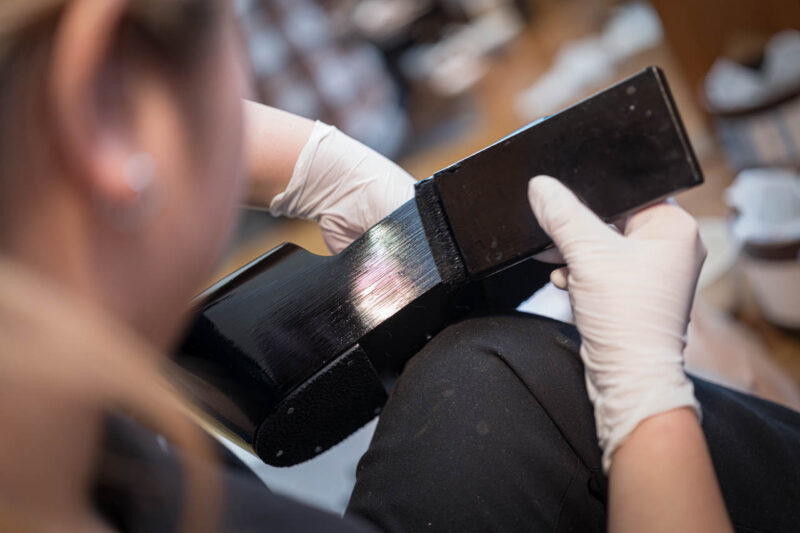 浅沓に漆の下地を丁寧に塗り重ねていく工程。刷毛の動きひとつで艶や仕上がりが決まるため、集中力と均一な手さばきが求められる。漆塗りは浅沓づくりの要ともいえる大切な作業だ。