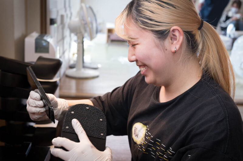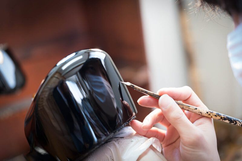 漆を塗り重ねる繊細な手仕事を担うのは、若き職人の確かな手とこの笑顔。彼女の姿を見ていると、日本の伝統工芸の未来が明るく照らされていることを実感する。