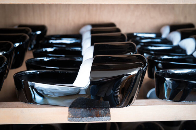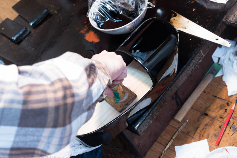 奥の部屋では、漆塗りの工程が静かに進められていた。ある職人は刷毛を手に、浅沓の表面に黒漆を塗っていた。塗っては乾かし、研ぎ、また塗る――その繰り返しでようやく漆の奥深い艶が現れる。