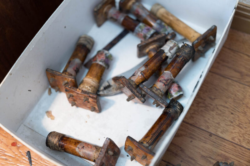 漆塗り作業に欠かせない“つくう”。履物の内部に差し込み、塗装中に本体へ手が触れないよう固定するための道具。竹や木で作られ、使い込まれた表情から長年の手仕事の歴史がにじむ。