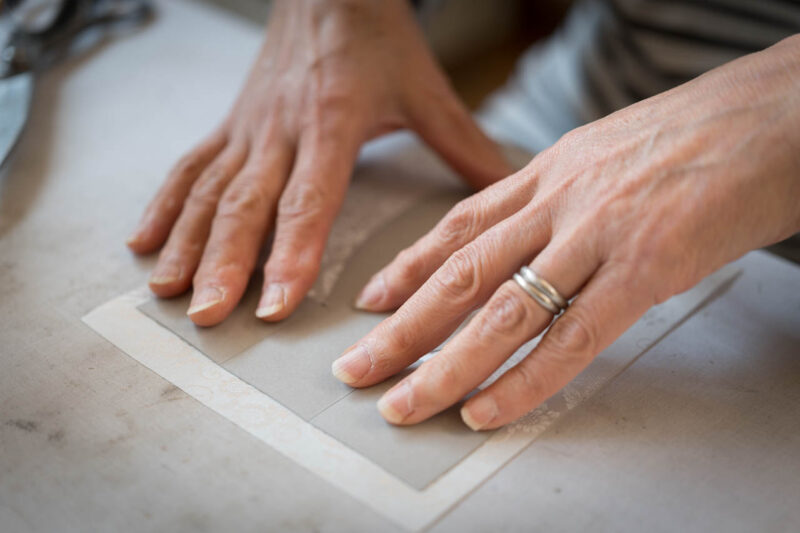 烏帽子の制作に取り組む職人の手元。寸分の狂いも許されない型紙合わせは、経験と感覚の積み重ねによって支えられている。手仕事の温度と緊張感が伝わる瞬間。