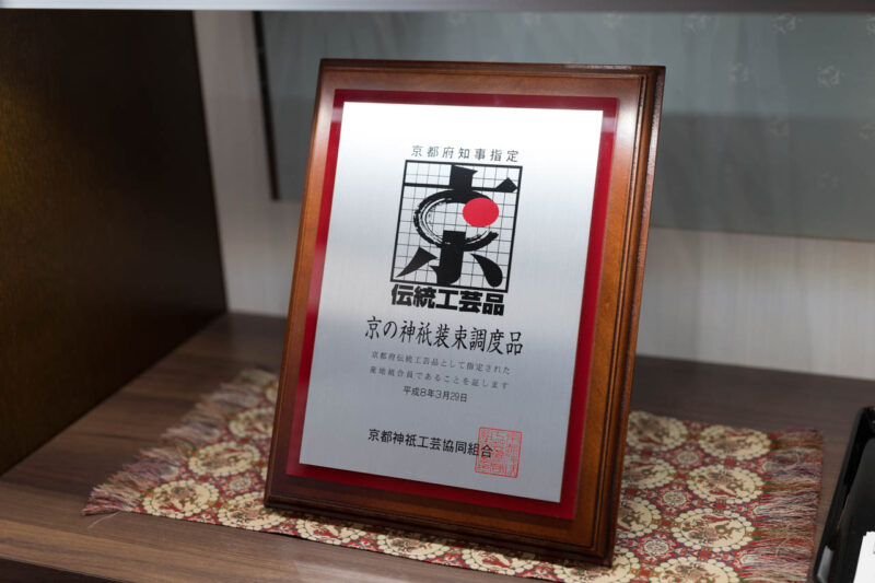入り口を入るとまず目に飛び込んでくるのは、「京の神祇装束調度品」として京都府から伝統工芸品に指定された誇りの証。橋本甚蔵商店が長年培ってきた技と格式が、静かに来訪者を迎える。