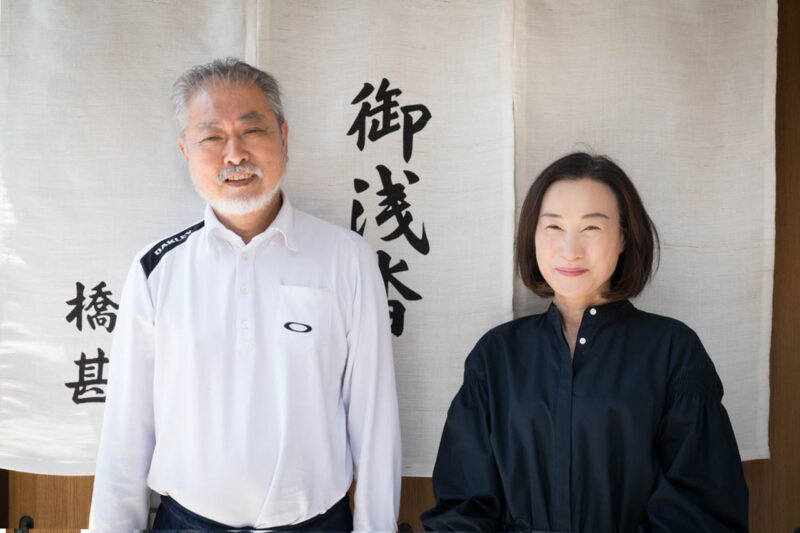 三代目当主・橋本ご夫妻。のれんの前に立ち、受け継がれる伝統と誇りを静かに物語る。