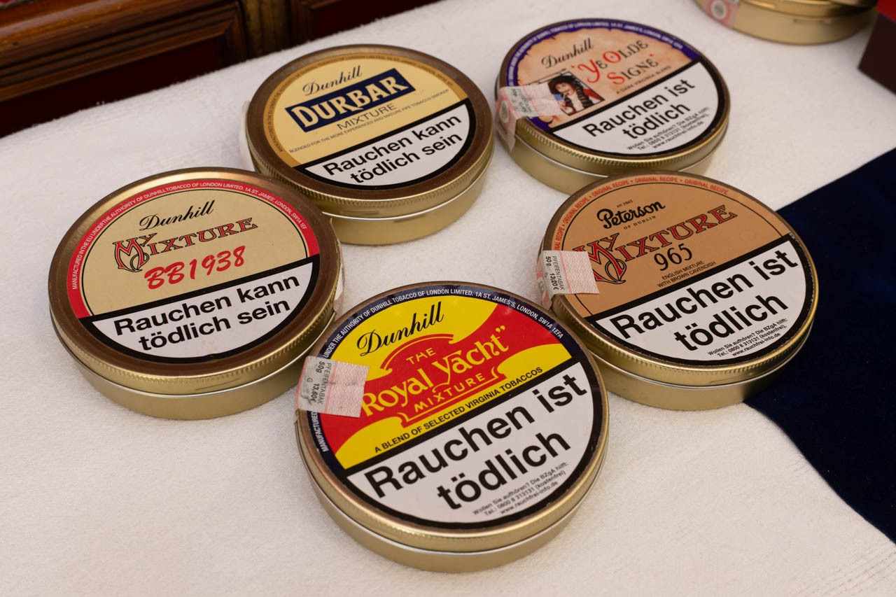 この日に用意されたダンヒルのタバコ。BB1938、Royal Yacht、Ye Olde Signe、965、そしてDURBARといった銘柄が揃い、いずれもブリティッシュ・テイストを象徴するブレンドで、葉本来の香りを純粋に引き出すのが特徴だ。カルモン・ヘナー氏のお気に入りはDURBARで、タバコの葉から立ちのぼる自然なシュガーのような甘みが「たまらない」と語っていた。