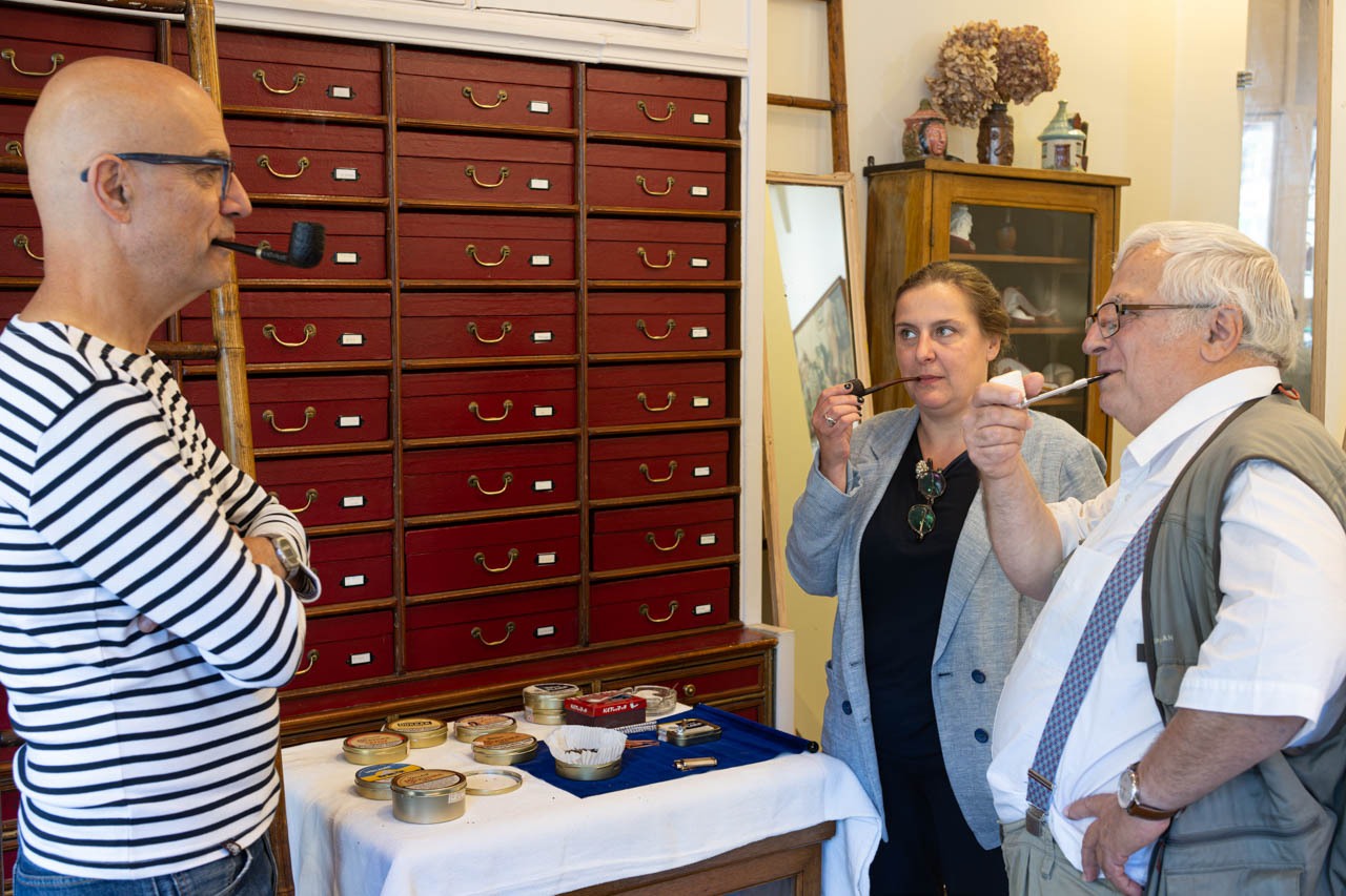 階上では、訪れた常連客たちがダンヒル(現在はピーターソンのブランドに移った)の葉を試していた。La Pipe du Nord のオーナー、マリー=オレリーさんも加わり、香りと味わいを確かめながら談笑する光景は、パイプ文化が紡ぐ豊かな社交の時間そのものだった。