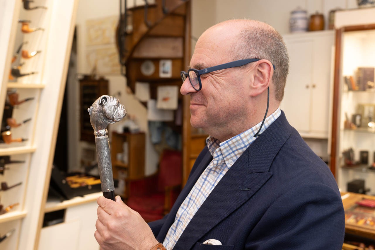 ダンヒルのディレクター、カルモン・ヘナー(Kalmon Hener)氏が手にするステッキの犬の意匠は、氏の愛犬マックスをモデルにしたもの。ブランドのクラフツマンシップに、個人的な愛情と遊び心が重ねられた逸品である。
