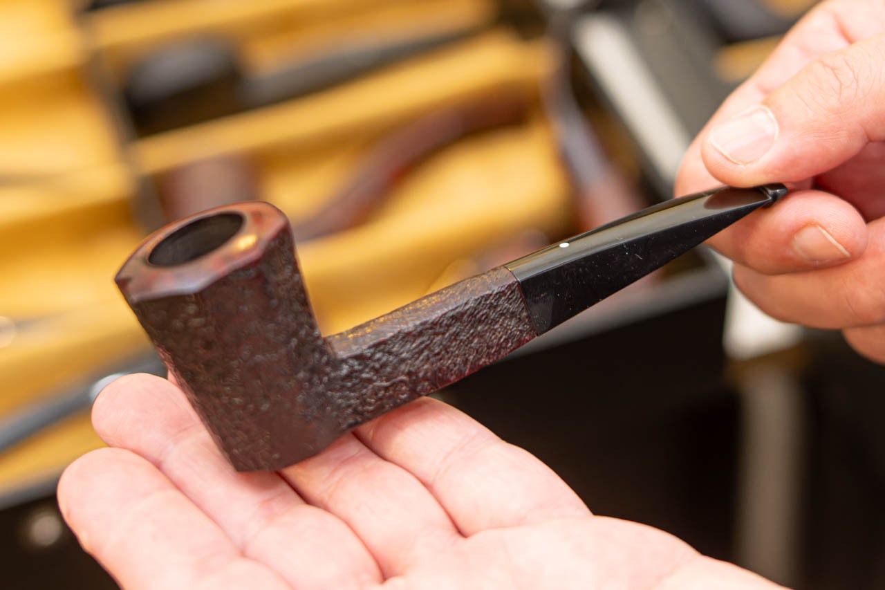 ボウルからステムにかけての軸が角張ったユニークなシェイプ。クラシックなビリヤードの造形に個性的なエッジを加え、存在感を際立たせている。ダンヒルのコレクションの中でも、伝統と遊び心を融合させた「変わり種」として印象的な一本。