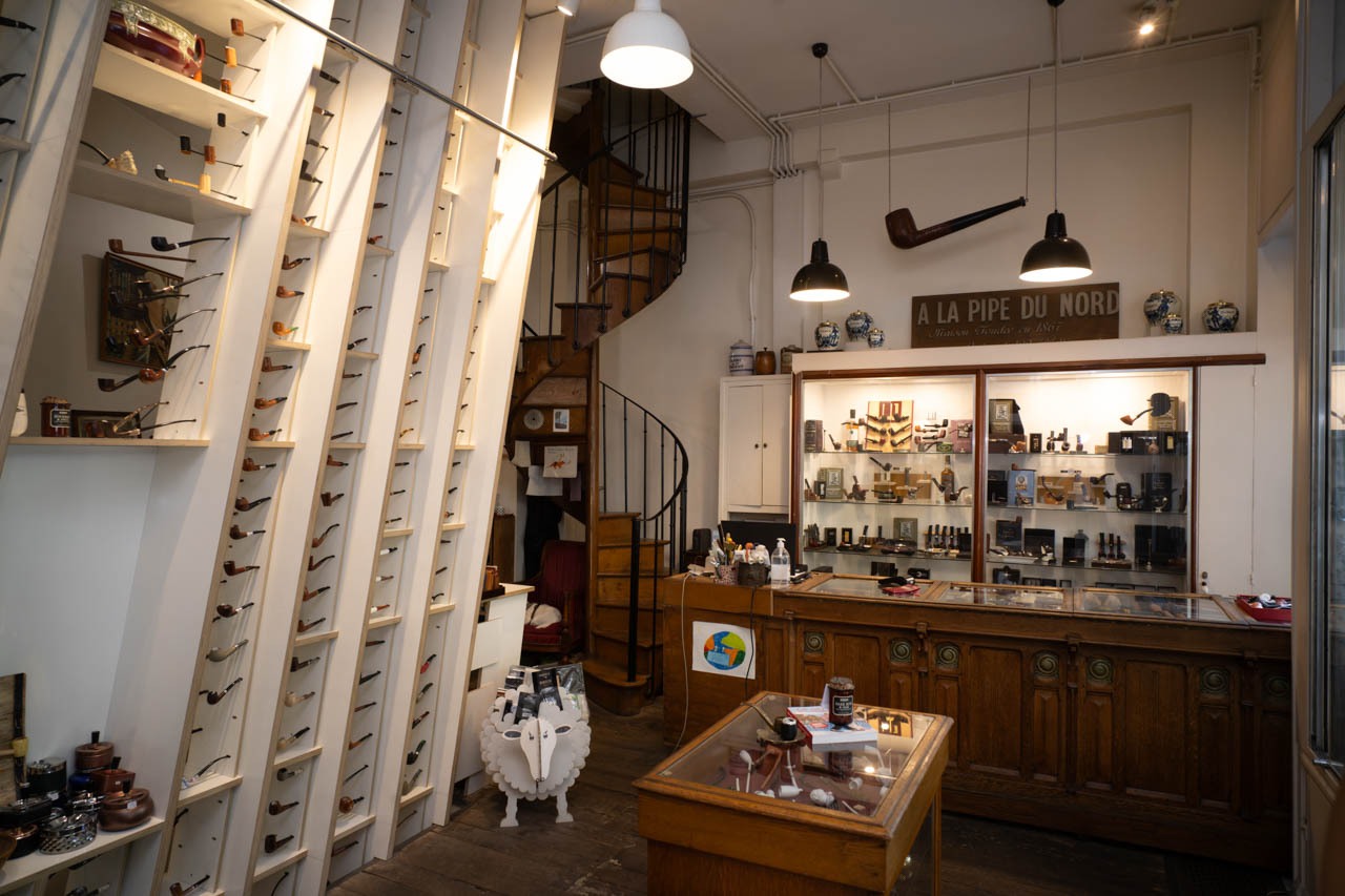 街角のタバコ屋でパイプを見かけることはあっても、これほどずらりとパイプが並ぶ光景は珍しい。La Pipe du Nordの店内には、形も素材も多様な一点物のパイプが壁一面に並び、まさに愛煙家のための聖域となっている。